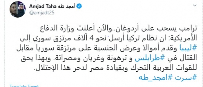 وكتب في تغريدة عبر "تويتر" رصدها "المشهد العربي": "ترامب يسحب على أردوغان.. والآن أعلنت وزارة الدفاع الأمريكية: أن نظام تركيا أرسل نحو 4 آلاف مرتزق سوري إلى ليبيا وقدم أموالا وعرض الجنسية على مرتزقة سوريا مقابل القتال في طرابلس وترهونة وغريان ومصراتة".