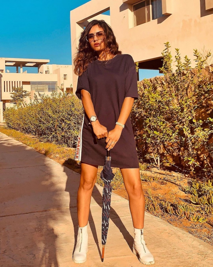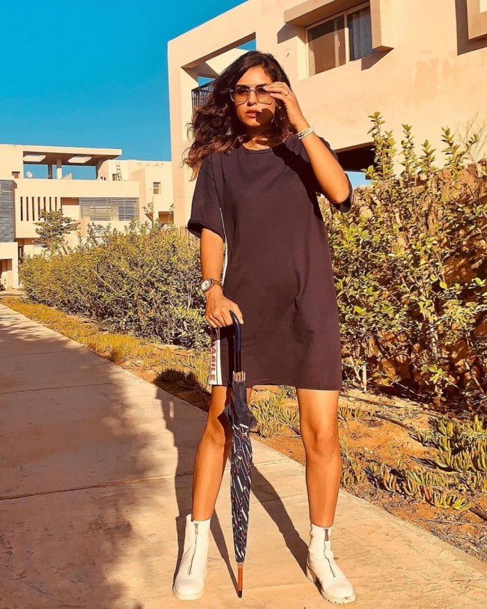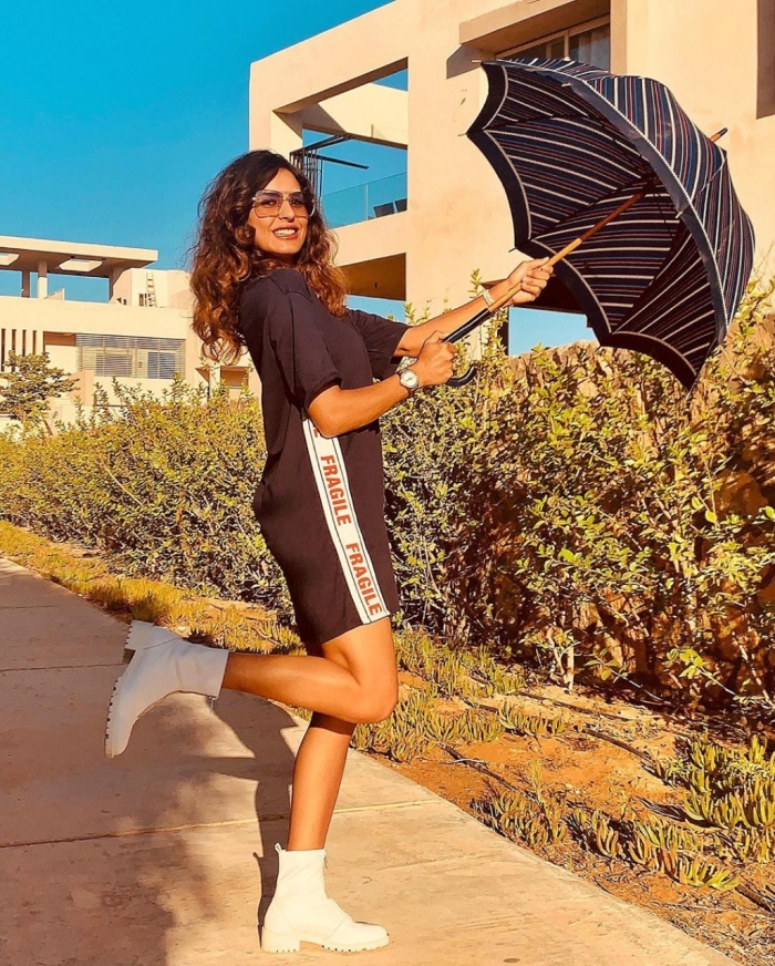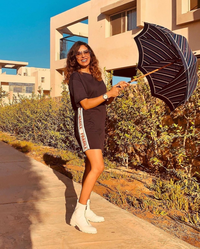وظهرت ريهام في الصور بإطلالة كاجوال، وترتدي نظارة شمسية وتسمك بيدها شمسية.