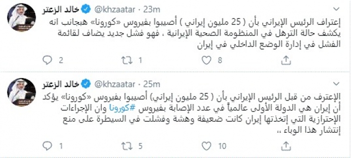 وقال في تغريدات عبر "تويتر" رصدها "المشهد العربي": "الاعتراف من قبل الرئيس الإيراني بأن (25 مليون إيراني) أصيبوا بفيروس كورونا يؤكد أن إيران هي الدولة الأولى عالمياً في عدد الإصابة بفيروس كورونا وأن الإجراءات الاحترازية التي إتخذتها إيران كانت ضعيفة وهشة وفشلت في السيطرة على منع انتشار هذا الوباء".