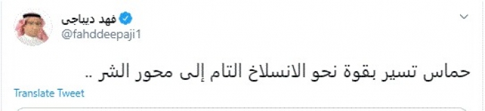 وقال في تغريدة عبر "تويتر" رصدها "المشهد العربي": "حماس تسير بقوة نحو الانسلاخ التام إلى محور الشر".