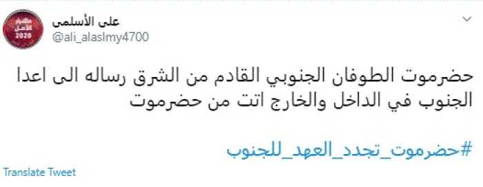 وكتب في تغريدة عبر "تويتر" رصدها "المشهد العربي": "حضرموت الطوفان الجنوبي القادم من الشرق رسالة إلى أعداء الجنوب في الداخل والخارج أتت من حضرموت.. حضرموت تجدد العهد للجنوب".