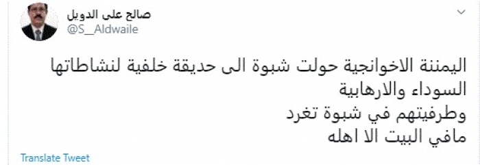 وكتب في تغريدة عبر "تويتر" رصدها "المشهد العربي": "اليمننة الإخوانجية حولت شبوة إلى حديقة خلفية لنشاطاتها السوداء والإرهابية".