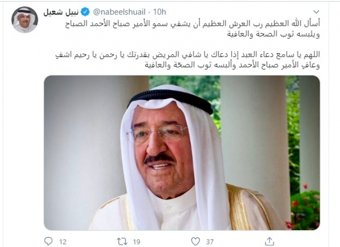 ونشر "شعيل" صورة للأمير صباح، عبر حسابه بموقع "تويتر"، وعلق: "أسأل الله العظيم رب العرش العظيم أن يشفي سمو