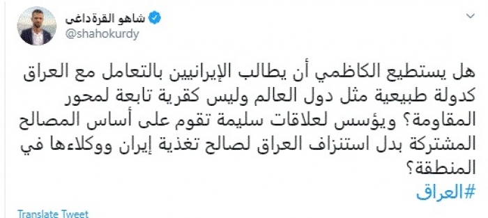 وقال في تغريدة عبر "تويتر" رصدها "المشهد العربي": "هل يستطيع الكاظمي أن يطالب الإيرانيين بالتعامل مع العراق كدولة طبيعية مثل دول العالم وليس كقرية تابعة لمحور المقاومة؟".