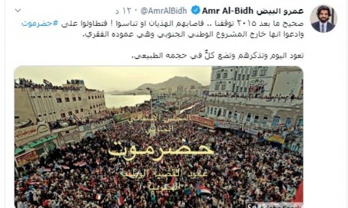 وكتب "البيض" في تغريدة عبر تويتر، رصدها "المشهد العربي": "صحيح ما بعد ٢٠١٥ توقفنا .. فأصابهم الهذيان أو تناسوا فتطاولوا على حضرموت وادعوا أنها خارج المشروع الوطني الجنوبي وهي عموده الفقري".