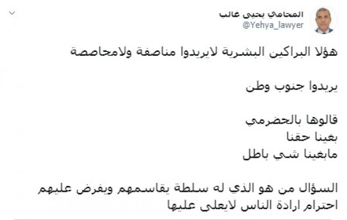 وكتب "غالب" في تغريدة عبر حسابه بتويتر، رصدها "المشهد العربي": "هؤلاء البراكين البشرية لايريدون مناصفة ولامحاصصة، يريدون جنوب وطن، قالوها بالحضرمي، بغينا حقنا مابغينا شي باطل".