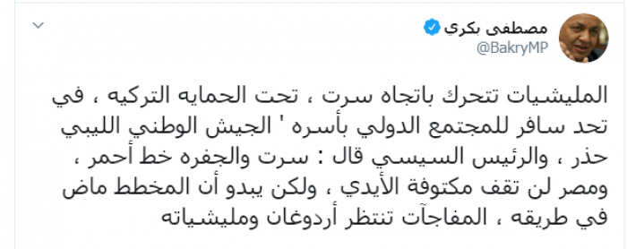 وكتب عبر تغريدة له على "تويتر" رصدها " المشهد العربي":"المليشيات تتحرك باتجاه سرت، تحت الحماية التركية، في تحد سافر للمجتمع الدولي بأسره ' الجيش الوطني الليبي حذر ، والرئيس السيسي قال، سرت والجفرة خط أحمر، ومصر لن تقف مكتوفة الأيدي، ولكن يبدو أن المخطط ماض في طريقه ، المفاجآت تنتظر أردوغان ومليشياته".