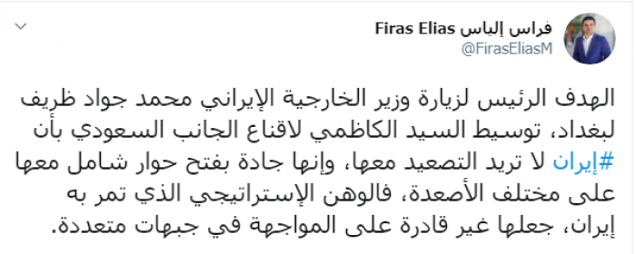 وكتب عبر تغريدة له على "تويتر" رصدها " المشهد العربي": " الهدف الرئيس لزيارة وزير الخارجية الإيراني محمد جواد ظريف لبغداد، توسيط السيد الكاظمي لإقناع الجانب السعودي بأن إيران لا تريد التصعيد معها، وإنها جادة بفتح حوار شامل معها على مختلف الأصعدة، فالوهن الاستراتيجي الذي تمر به إيران، جعلها غير قادرة على المواجهة في جبهات متعددة".
