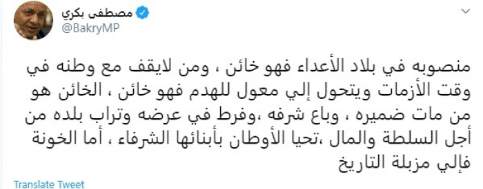 وقال في تغريدات عبر "تويتر" رصدها "المشهد العربي": "من يدعم الإرهابي أردوغان ضد وطنه فهو خائن، ومن يقف مع إثيوبيا ويدعم أطماعها في مياه النيل ضد بلاده فهو خائن ، ومن يشكك في جيش بلاده ويسعي إلي التحريض ضد مؤسسات دولته فهو خائن".