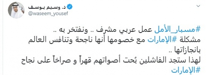 وقال في تغريدة عبر "تويتر" رصدها "المشهد العربي": "مسبار الأمل عمل عربي مشرف.. ونفتخر به.. مشكلة الإمارات مع خصومها أنها ناجحة وتنافس العالم بانجازاتها".