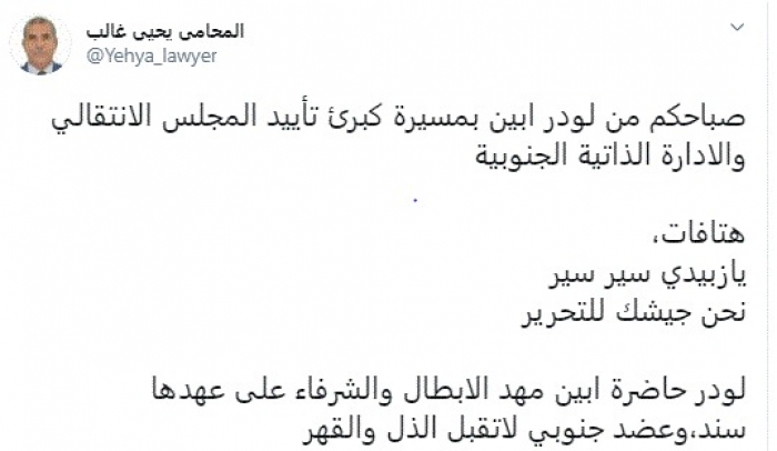 وقال في تغريدة عبر "تويتر" رصدها "المشهد العربي": "صباحكم من لودر أبين بمسيرة كبرئ تأييد المجلس الانتقالي والإدارة الذاتية الجنوبية".