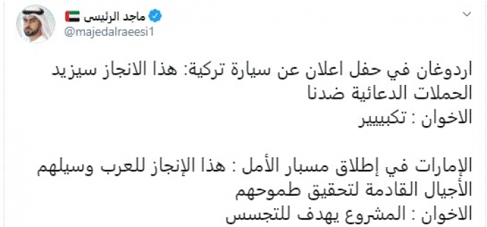 وقال في تغريدة عبر "تويتر" رصدها "المشهد العربي": "أردوغان في حفل إعلان عن سيارة تركية: هذا الإنجاز سيزيد الحملات الدعائية ضدنا الإخوان: تكبير".