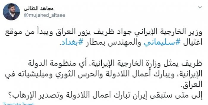 وقال في تغريدة عبر "تويتر" رصدها "المشهد العربي": "وزير الخارجية الإيراني جواد ظريف يزور العراق ويبدأ من موقع اغتيال سليماني والمهندس بمطار بغداد".