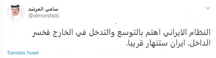 وقال في تغريدة عبر "تويتر" رصدها "المشهد العربي": "النظام الإيراني اهتم بالتوسع والتدخل في الخارج فخسر الداخل. إيران ستنهار قريبًا".