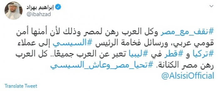 وكتب في تغريدة عبر "تويتر" رصدها "المشهد العربي": "نقف مع مصر وكل العرب رهن لمصر وذلك لأن أمنها أمن قومي عربي، ورسائل فخامة الرئيس السيسي إلى عملاء تركيا وقطر في ليبيا تعبر عن العرب جميعًا.. كل العرب رهن مصر الكنانة. تحيا مصر وعاش السيسي".