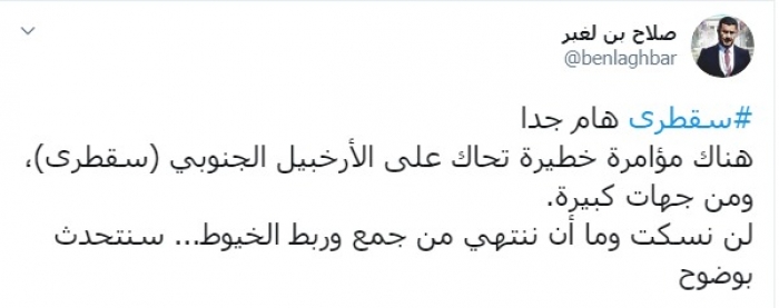 وكتب عبر تغريدة له على "تويتر" رصدها "المشهد العربي": "سقطرى هام جدا، هناك مؤامرة خطيرة تحاك على الأرخبيل الجنوبي (سقطرى)، ومن جهات كبيرة، لن نسكت وما أن ننتهي من جمع وربط الخيوط سنتحدث بوضوح".
