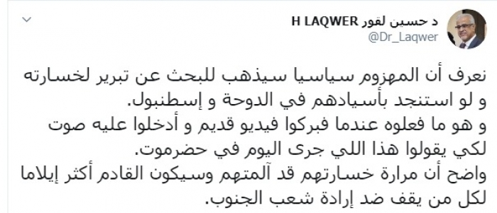 وكتب عبر تغريدة له على "تويتر" رصدها "المشهد العربي": "نعرف أن المهزوم سياسيا سيذهب للبحث عن تبرير لخسارته ولو استنجد بأسيادهم في الدوحة وإسطنبول، وهو ما فعلوه عندما فبركوا فيديو قديم وأدخلوا عليه صوتا لكي يقولوا هذا اللي جرى اليوم في حضرموت، واضح أن مرارة خسارتهم قد آلمتهم وسيكون القادم أكثر إيلاما لكل من يقف ضد إرادة شعب الجنوب".