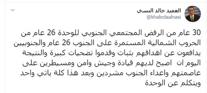 وكتب عبر تغريدة له على "تويتر" رصدها "المشهد العربي": "30 عاما من الرفض المجتمعي الجنوبي للوحدة، 26عاما من الحروب الشمالية المستمرة على الجنوب، 26عاما والجنوبيون يدافعون عن أهدافهم بثبات وقدموا تضحيات كبيرة والنتيجة اليوم أن أصبح لديهم قيادة وجيش وأمن ومسيطرون على عاصمتهم وأعداء الجنوب مشردون وبعد هذا كله يأتي واحد ويتكلم عن الوحدة".