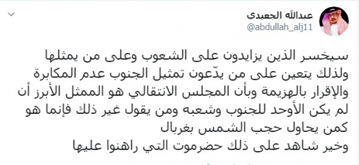 أكد الشاعر عبد الله الجعيدي، الأحد، أن المجلس الانتقالي هو الممثل الأوحد لشعب الجنوب.