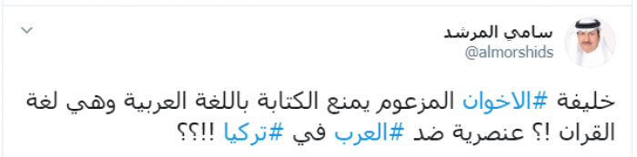 وكتب عبر تغريدة له على "تويتر" رصدها " المشهد العربي": "خليفة الإخوان المزعوم يمنع الكتابة باللغة العربية وهي لغة القران، عنصرية ضد العرب في تركيا".