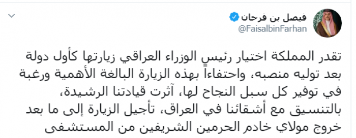 وكتب عبر تغريدة له على " تويتر" رصدها " المشهد العربي": "تقدر المملكة اختيار رئيس الوزراء العراقي زيارتها كأول دولة بعد توليه منصبه، واحتفاءاً بهذه الزيارة البالغة الأهمية ورغبة في توفير كل سبل النجاح لها، آثرت قيادتنا الرشيدة، بالتنسيق مع أشقائنا في العراق، تأجيل الزيارة إلى ما بعد خروج مولاي خادم الحرمين الشريفين من المستشفى".