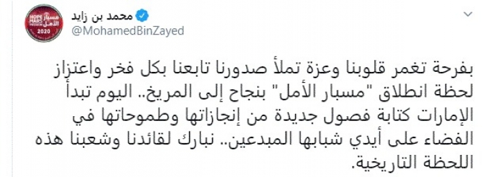 وكتب في تغريدة عبر "تويتر" رصدها "المشهد العربي": "بفرحة تغمر قلوبنا وعزة تملأ صدورنا تابعنا بكل فخر واعتزاز لحظة انطلاق مسبار الأمل بنجاح إلى المريخ".