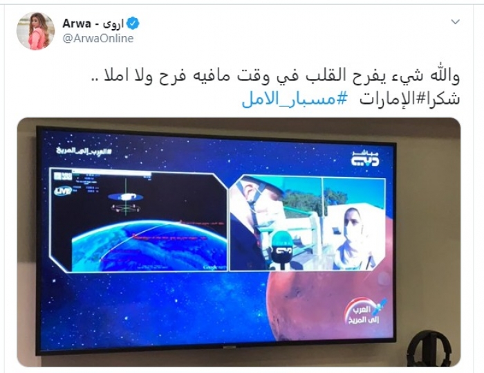 وكتبت أروى ، عبر حسابها الرسمي على تويتر: "والله شيء يفرح القلب في وقت مافيه فرح ولا أملا، شكرا الإمارات، مسبار الأمل".