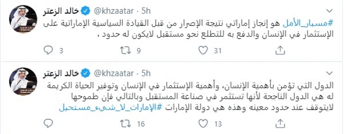 وقال في تغريدات عبر "تويتر" رصدها "المشهد العربي": "الدول التي تؤمن بأهمية الإنسان، وأهمية الإستثمار في الإنسان وتوفير الحياة الكريمة له هي الدول الناجحة لأنها تستثمر في صناعة المستقبل وبالتالي فإن طموحها لايتوقف عند حدود معينه وهذه هي دولة الإمارات