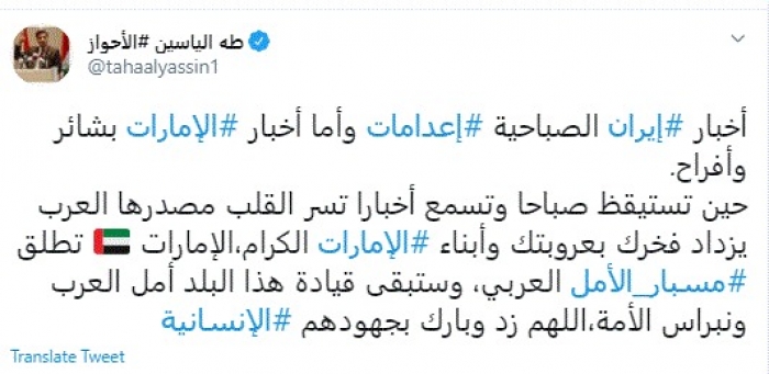 وقال في تغريدة عبر "تويتر" رصدها "المشهد العربي": "أخبار إيران الصباحية إعدامات وأما أخبار الإمارات بشائر وأفراح".