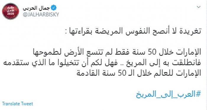 وقال في تغريدة عبر "تويتر" رصدها "المشهد العربي": "تغريدة لا أنصح النفوس المريضة بقراءتها: الإمارات خلال 50 سنة فقط لم تتسع الأرض لطموحها فانطلقت به إلى المريخ".