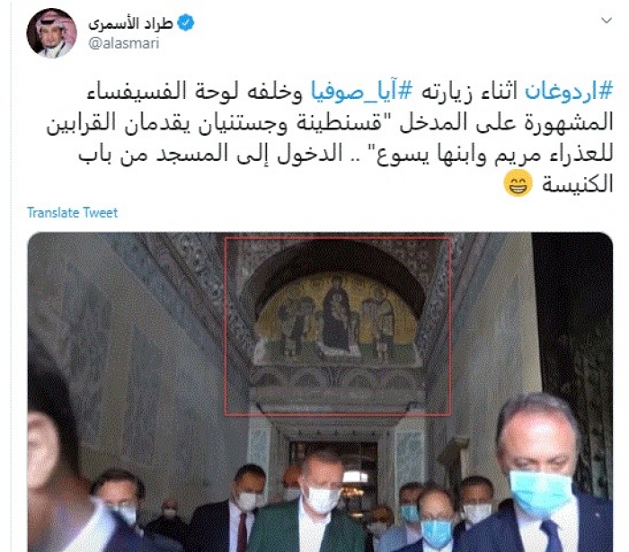 سخر الإعلامي السعودي طراد الأسمري، اليوم، من زيارة الرئيس التركي رجب طيب أردوغان لآيا صوفيا بعد تحويله لمسجد.