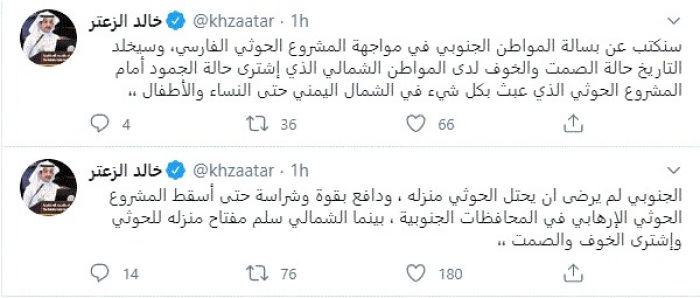وقال في تغريدات عبر "تويتر" رصدها "المشهد العربي": "الجنوبي لم يرضَ أن يحتل الحوثي منزله، ودافع بقوة وشراسة حتى أسقط المشروع الحوثي الإرهابي في المحافظات الجنوبية، بينما الشمالي سلم مفتاح منزله للحوثي واشترى الخوف والصمت".