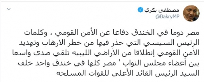 وكتب عبر تغريدة له على "تويتر" رصدها " المشهد العربي": "مصر دوما في الخندق دفاعًا عن الأمن القومي، وكلمات الرئيس السيسي التي حذر فيها من خطر الإرهاب وتهديد الأمن القومي انطلاقا من الأراضي الليبية تلقى صدى واسعا بين أعضاء مجلس النواب، مصر كلها في خندق واحد خلف السيد الرئيس القائد الأعلى للقوات المسلحة".