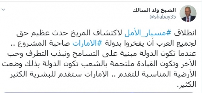 أكد الكاتب الصحفي الموريتاني الشيخ ولد السالك، اليوم الإثنين، أن يجب على جميع العرب الافتخار بمسبار الأمل ودولة الإمارات صاحبة المشروع.