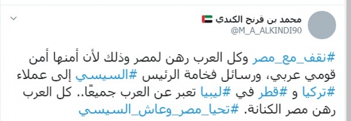 وكتب عبر تغريدة له على "تويتر" رصدها " المشهد العربي":"نقف مع مصر وكل العرب رهن لمصر وذلك لأن أمنها أمن قومي عربي، ورسائل فخامة الرئيس السيسي إلى عملاء تركيا و قطر في ليبيا تعبر عن العرب جميعًا، كل العرب رهن مصر الكنانة.