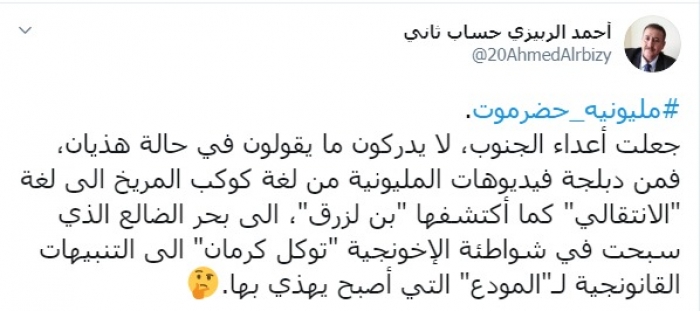 وكتب عبر تغريدة له على "تويتر" رصدها "المشهد العربي": "مليونية حضرموت، جعلت أعداء الجنوب، لا يدركون ما يقولون في حالة هذيان، فمن دبلجة فيديوهات المليونية من لغة كوكب المريخ إلى لغة "الانتقالي" كما اكتشفها "بن لزرق"، إلى بحر الضالع الذي سبحت في شواطئه الإخونجية "توكل كرمان" إلى التنبيهات القانونجية لـ"المودع" التي أصبح يهذي بها".