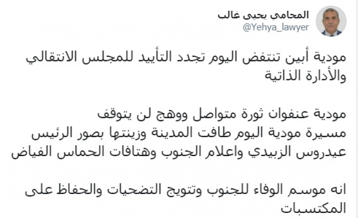 وكتب عبر تغريدة له على "تويتر" رصدها "المشهد العربي": "مودية أبين تنتفض اليوم تجدد التأييد للمجلس الانتقالي والإدارة الذاتية، مودية عنفوان ثورة متواصل ووهج لن يتوقف".