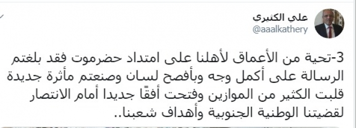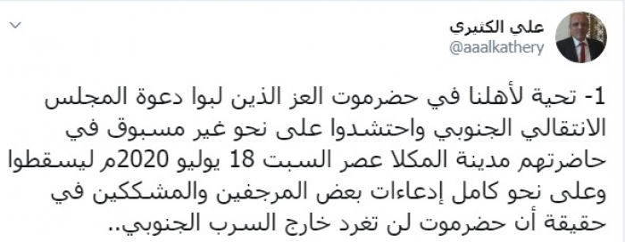 وكتب عبر تغريدات له على "تويتر" رصدها "المشهد العربي": "تحية لأهلنا في حضرموت الأعزاء الذين لبوا دعوة المجلس الانتقالي الجنوبي واحتشدوا على نحو غير مسبوق في حاضرتهم مدينة المكلا عصر السبت 18 يوليو 2020م ليسقطوا وعلى نحو كامل ادعاءات بعض المرجفين والمشككين في حقيقة أن حضرموت لن تغرد خارج السرب الجنوبي".