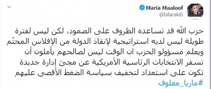 أكدت الإعلامية اللبنانية ماريا معلوف، اليوم الإثنين، أن حزب الله الإرهابي قد تساعده الظروف على الصمود، لكن ليس لفترة طويلة.