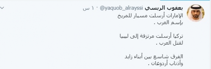 وكتب عبر تغريدة له على "تويتر" رصدها " المشهد العربي": "الإمارات أرسلت مسبار للمريخ باسم العرب، تركيا أرسلت مرتزقة إلى ليبيا