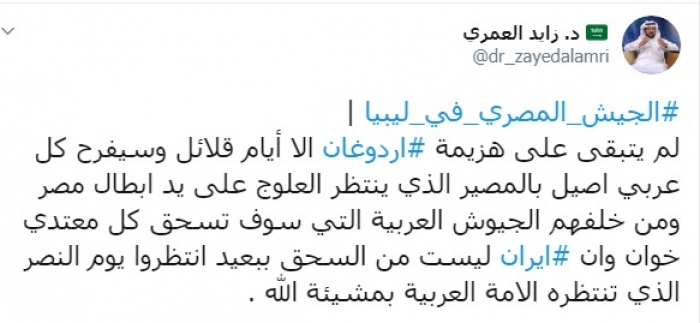 وكتب عبر تغريدة له على "تويتر" رصدها " المشهد العربي": "لم يتبقى على هزيمة أردوغان إلا أيام قلائل وسيفرح كل عربي أصيل بالمصير الذي ينتظر العلوج على يد أبطال مصر ومن خلفهم الجيوش العربية التي سوف تسحق كل معتدي خوان وإن إيران ليست من السحق ببعيد انتظروا يوم النصر الذي تنتظره الأمة العربية بمشيئة الله".