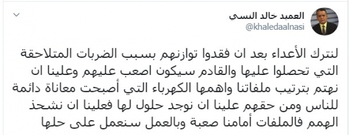 وكتب عبر تغريدة له على "تويتر" رصدها " المشهد العربي": "لنترك الأعداء بعد أن فقدوا توازنهم بسبب الضربات المتلاحقة التي تحصلوا عليها والقادم سيكون أصعب عليهم، وعلينا أن نهتم بترتيب ملفاتنا وأهمها الكهرباء التي أصبحت معاناة دائمة للناس ومن حقهم علينا أن نوجد حلولا لها فعلينا أن نشحذ الهمم فالملفات أمامنا صعبة وبالعمل سنعمل على حلها".