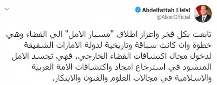 أكد الرئيس المصري عبد الفتاح السيسي، الإثنين، أن إطلاق الإمارات لـ"مسبار الأمل" يجسد الأمل المنشود في استرجاع أمجاد الأمة العربية والإسلامية.