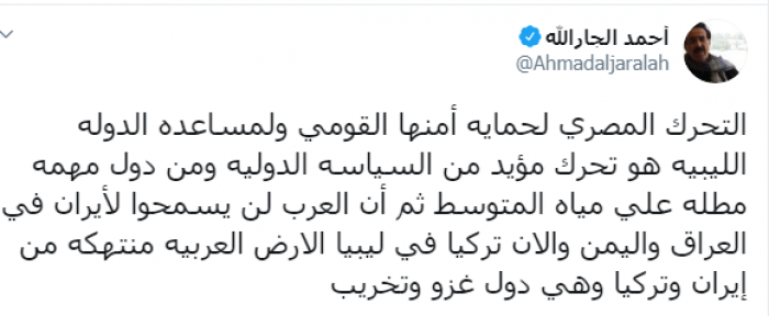وكتب عبر تغريدة له على "تويتر" رصدها " المشهد العربي": "التحرك المصري لحماية أمنها القومي ولمساعدة الدولة الليبية هو تحرك مؤيد من السياسة الدولية ومن دول مهمة مطلة على مياه المتوسط ثم أن العرب لن يسمحوا لإيران في العراق واليمن، والآن تركيا في ليبيا، الأرض العربية منتهكة من إيران وتركيا وهي دول غزو وتخريب".