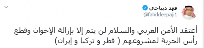 وكتب عبر تغريدة له على "تويتر" رصدها " المشهد العربي": "اعتقد الأمن العربي والسلام لن يتم إلا بإزالة الإخوان وقطع رأس الحربة لمشروعهم ( قطر و تركيا و إيران)".