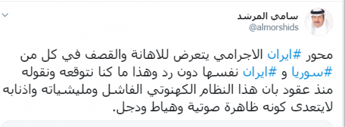 وكتب عبر تغريدة له على "تويتر" رصدها " المشهد العربي": "محور إيران الإجرامي يتعرض للإهانة والقصف في كل من سوريا وإيران نفسها دون رد وهذا ما كنا نتوقعه ونقوله منذ عقود بأن هذا النظام الكهنوتي الفاشل ومليشياته وأذنابه لا يتعدى كونه ظاهرة صوتية وهياط ودجل".