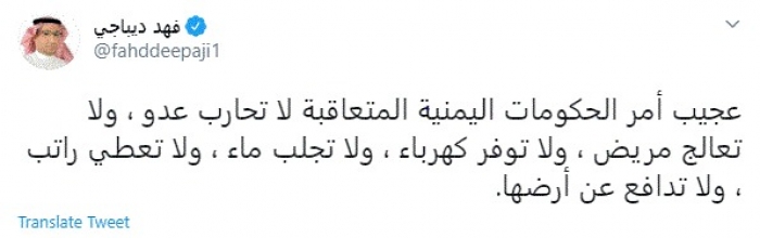 وقال في تغريدة عبر "تويتر" رصدها "المشهد العربي": "عجيب أمر الحكومات اليمنية المتعاقبة لا تحارب عدو ، ولا تعالج مريض ، ولا توفر كهرباء ، ولا تجلب ماء ، ولا تعطي راتب ، ولا تدافع عن أرضها".