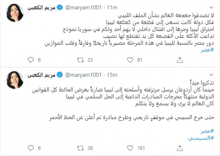 وقالت في تغريدات عبر "تويتر" رصدها "المشهد العربي": "تذكروا جيداً حينما كان أردوغان يرسل مرتزقته وأسلحته إلى ليبيا ضارباً بعرض الحائط كل القوانين الدولية منتهكاً مخرجات المبادرات الداعية إلى الحل السلمي في ليبيا كان العالم لا يرى ولا يسمع ولا يتكلم حتى خرج السيسي في موقفٍ تاريخي وطرح مبادرة ثم أعلن عن الخط الأحمر".