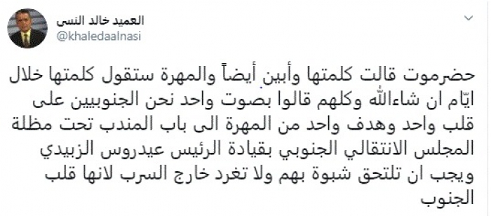 النسي: الجنوبيون على قلب وهدف واحد تحت مظلة الانتقالي
