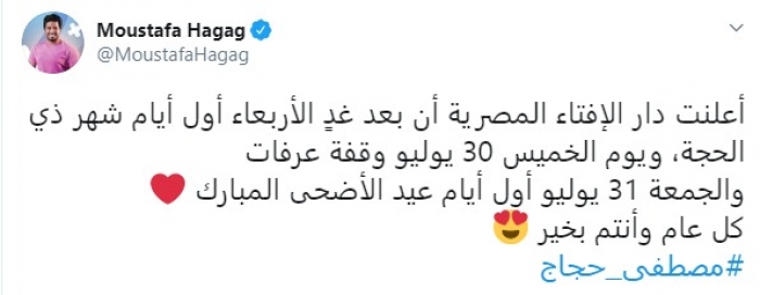 وكتب حجاج، عبر حسابه على تويتر، : "أعلنت دار الإفتاء المصرية أن غدٍ الأربعاء أول أيام شهر ذي الحجة، ويوم الخميس 30 يوليو وقفة عرفات.. والجمعة 31 يوليو أول أيام عيد الأضحى المبارك.. كل عام وأنتم بخير".